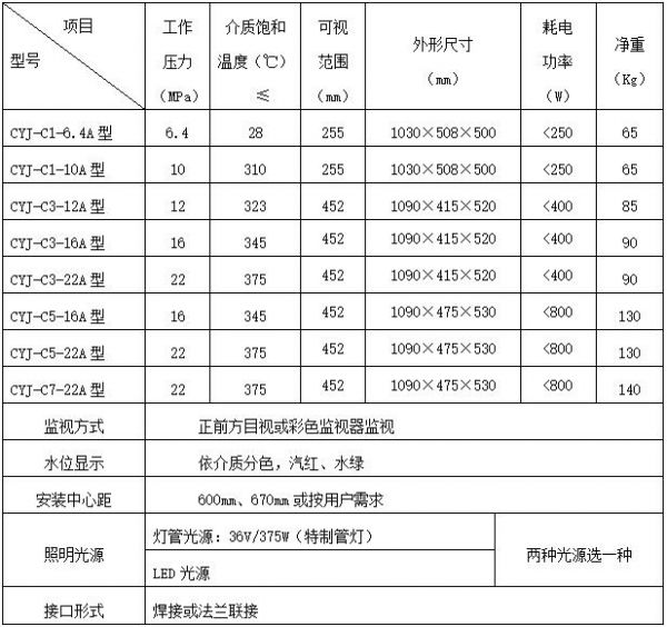 `CYJ型窗式高壓、超高壓彩色液位計(jì)是用于各發(fā)電廠、石油化工行業(yè)及各工礦企業(yè)的蒸汽鍋爐或其它壓力容器監(jiān)測(cè)水位的一次就地直讀儀表。它是在總結(jié)國(guó)內(nèi)外各種透射式雙色水位計(jì)優(yōu)點(diǎn)基礎(chǔ)上新研制的長(zhǎng)窗式高壓、超高壓雙色水位計(jì),用汽紅水綠顯示液位,無(wú)水全紅、滿水全綠。紅綠色界面即為實(shí)際水位。可在現(xiàn)場(chǎng)直接觀察也可以配我公司生產(chǎn)的彩色工業(yè)電視監(jiān)視系統(tǒng),在控制室內(nèi)的監(jiān)視器熒屏上遠(yuǎn)程監(jiān)測(cè)現(xiàn)場(chǎng)實(shí)際水位。它與其它雙色水位計(jì)相比較,具有如下幾種特點(diǎn):