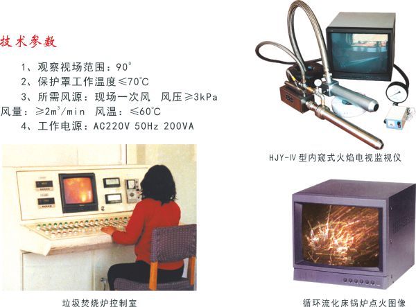HJY-Ⅳ型內(nèi)窺式火焰電視監(jiān)視儀是用于監(jiān)測(cè)爐內(nèi)照度較低的循環(huán)流化床鍋爐及垃圾焚燒爐爐內(nèi)物料狀態(tài)的彩色工業(yè)電視系統(tǒng),該產(chǎn)品是我公司技術(shù)人員與光學(xué)研究所部分科技人員專門針對(duì)循環(huán)流化床鍋爐和垃圾焚燒爐而共同開發(fā)研制的,只要光照度大于10LUX的環(huán)境條件即能清晰成像,在國(guó)內(nèi)處于領(lǐng)先地位。對(duì)于循環(huán)流化床鍋爐,因?yàn)闋t內(nèi)為密封狀態(tài),在點(diǎn)火及投料過(guò)程中極易造成高溫或低溫結(jié)焦,而爐內(nèi)照度又很低,用國(guó)內(nèi)現(xiàn)有的爐膛火焰監(jiān)視裝置看不到爐內(nèi)物料狀態(tài)。如采用HJY-Ⅳ型產(chǎn)品可看到爐內(nèi)物料狀態(tài)并指導(dǎo)投料并及時(shí)發(fā)現(xiàn)結(jié)焦趨勢(shì),從而避免結(jié)焦或投料過(guò)多造成點(diǎn)火過(guò)程中滅火。而垃圾焚燒爐,由于污染問(wèn)題,爐體為密封式,投料后極易將火壓滅,即使在燃燒時(shí),爐內(nèi)照度也非常低,通常在300LUX以下,而國(guó)內(nèi)常規(guī)產(chǎn)品需在500LUX照度下才能工作。所以只有采用HJY-Ⅳ型產(chǎn)品,才能指導(dǎo)投料及探針插孔并在遠(yuǎn)離現(xiàn)場(chǎng)的操作室內(nèi)清晰看到爐內(nèi)的垃圾焚燒狀態(tài),從而實(shí)現(xiàn)安全經(jīng)濟(jì)運(yùn)行。